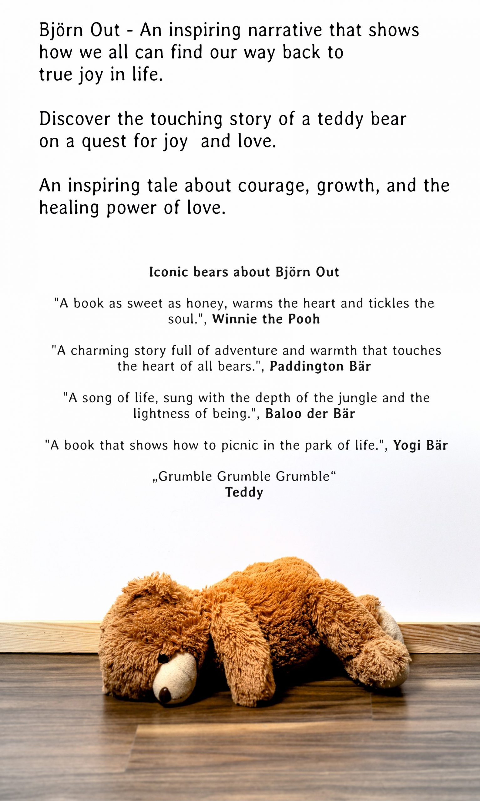 Tauchen Sie ein in die inspirierende Welt von “Björn Out” – eine herzerwärmende Geschichte über einen Teddybären, der seine eigene Kraft wiederentdeckt. Erfahren Sie, wie Björn, einst von Traurigkeit überwältigt, durch die Unterstützung seiner Freunde und die Abenteuer seiner Träume zu neuer Stärke findet. Björnout ist eine einzigartige Erzählung mit viel Potential.